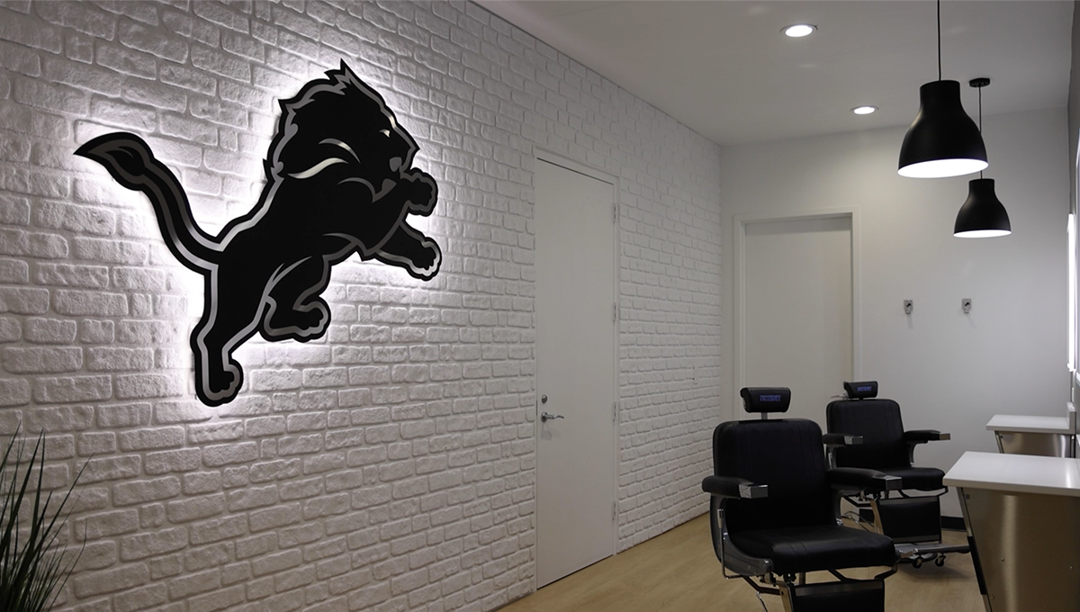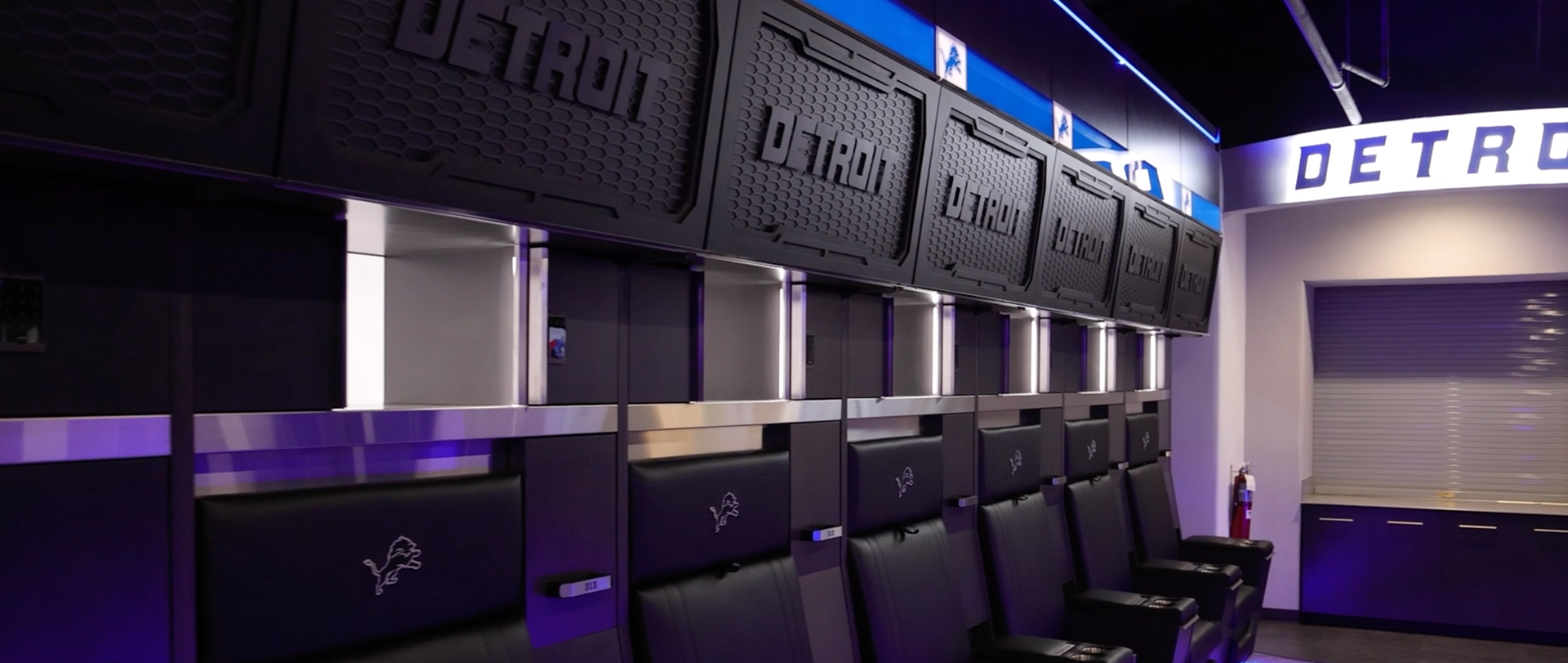 Champion Construction completed a full scale transformation of the Detroit Lions locker room, creating a high impact space designed for both performance and team culture. The renovation included the installation of custom lockers, new flooring, updated ceilings, and a complete package of branded wall graphics, ceiling features, and dimensional wall and ceiling signage that brings the Lions identity to life throughout the room. Champion also built out dedicated team spaces within the locker room, including a lounge style area with seating and a pool table, giving players a place to connect and recharge. A custom barber shop area rounds out the experience, adding a premium amenity that makes the space feel personal, elevated, and built for the everyday rhythm of an NFL program.